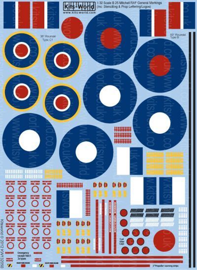 Two types of propeller decals, two types of propeller warning strips plus blank set, black 2" walkway lines. two styles of fuel filler decals, two styles of escape hatch markings (starboard side only?) Seac and RAF markings plus a a few common bomb tally styles.