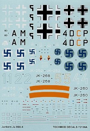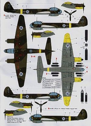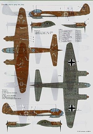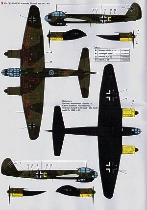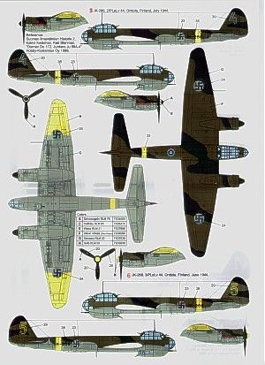 B3-AM 4/KG 54 Sicily 1943 Desert scheme; 4D+CP 8/KG 30 in Finland 1942 RLM 70/71/22; Finland Air Force JK-252/2; JK-256/1 both 1/PLeLv 44 1944 RLM 70/71/65; JK-260/4 2/PLeLv 44.