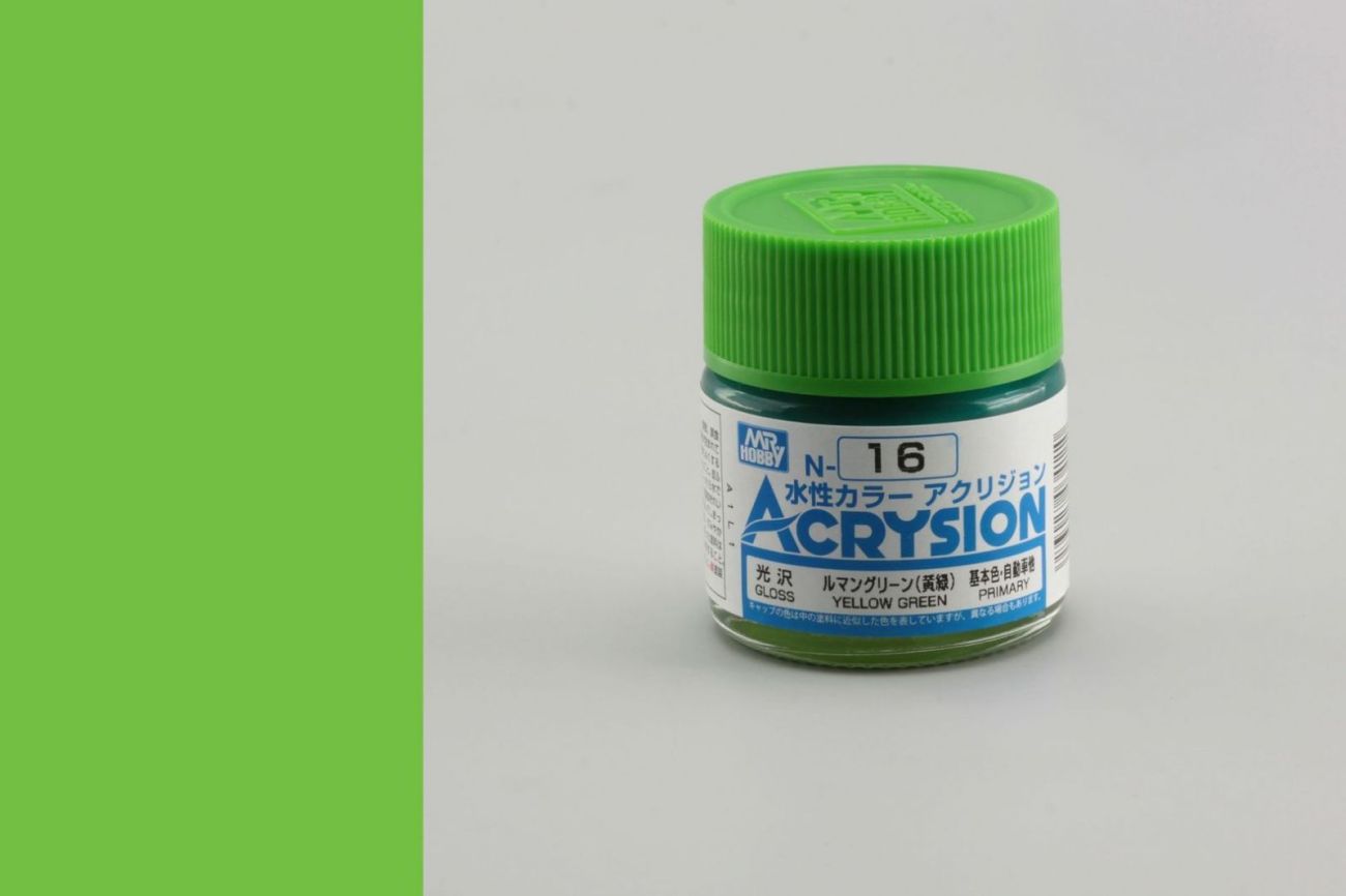 ZNAČENÍ V modrém poli nad názvem řady ACRYSION je v bílém rámečku číslo barvy. V bílém poli pod názvem řady uprostřed je název barvy. Vlevo od názvu je uvedeno, zda je barva matná (FLAT), lesklá (GLOSS), pololesklá (SEMI-GLOSS) nebo metalíza (METALIC). Vpravo od názvu je uvedeno užití. PRIMARY=základní barvy, AIRCRAFT=letadla, CAR=auta, TANK=tanky a bojová technika, SHIP=lodě, WEATHERING=patinovací barvy. V případě letadel, bojové techniky a lodí je uveden i stát a období používání barvy.