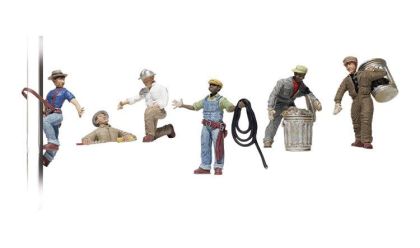 Six men are included in this set. One has shimmied up a utility pole, reaching back as if waiting to be handed tools. A man stands by with a cable or rope in his hand. Two men pick up trash, one with a can on his back, and the other is opening up another can. One man is kneeling down, talking and showing something to another in a manhole.