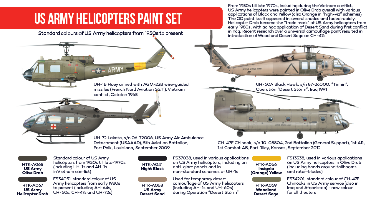 • HTK-A067 – US Army Helicopter Drab – FS34031, standard colour of US Army helicopters from early 1980s to present (including AH-64s, UH-60s, CH-47s and UH-72s)